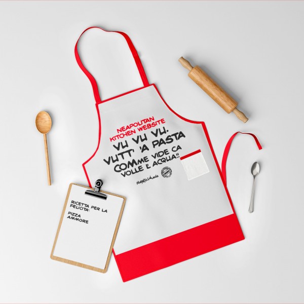 Grembiule da cucina "Vu vu vu" di cotone 100%. Il prodotto è realizzato interamente a Napoli; con le dimensioni di CM 100X58.