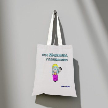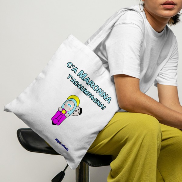 La borsa shopper è divertente e di colore di base bianco, con scritta tipica beneaugurale in napoletano e la scritta Napoli. Resistente, capiente, divertente.