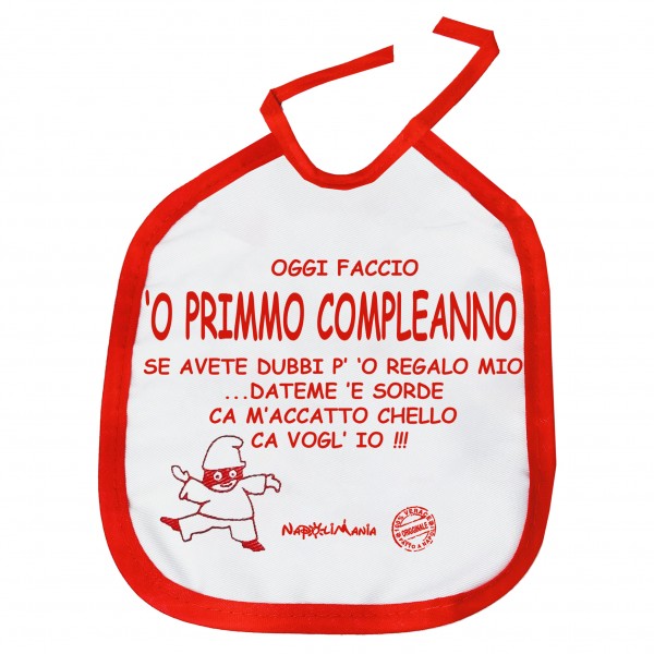 Bavetta di cotone bianca e rossa, stampata con frase in napoletano, O' Primmo Compleanno!! Un'idea regalo particolare e divertente per neonati e bambini piccoli da 1 a 36 mesi (sia maschio che femmina). Il pensiero ideale per festeggiare il primo compleanno del nuovo componente della famiglia, in maniera originale e tutta napoletana! Il prodotto, firmato Napolimania, è realizzato interamente a Napoli. Le dimensioni sono di CM 27X24 e il materiale è 100% cotone, altamente resistente e facile da lavare. I gadget creati da Napolimania possono essere considerati dai turisti italiani e stranieri come souvenir, ma anche come un nuovo modo della città di Napoli di presentarsi al mondo. Prodotti 100% napoletani... Diffidate dalle imitazioni!