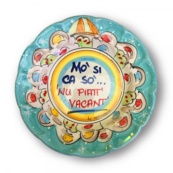 Piatto fondo in ceramica vietrese "Piatto vacant". Il prodotto è realizzato interamente a Napoli; con un diametro di CM 23 e un peso di circa G. 845.