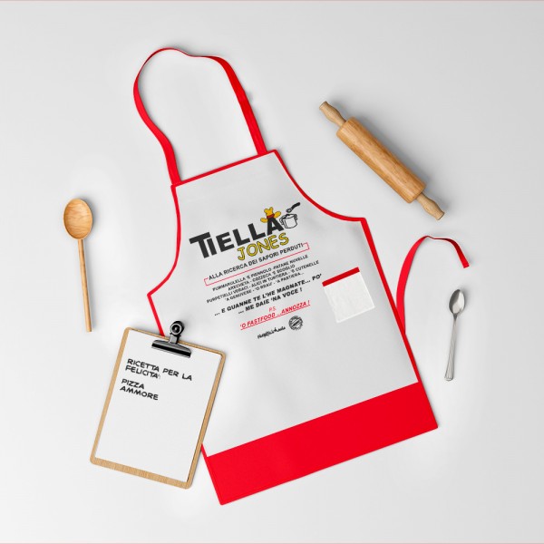 Grembiule da cucina "Tiella Jones" di cotone 100%. Il prodotto è realizzato interamente a Napoli; con le dimensioni di CM 100X58.