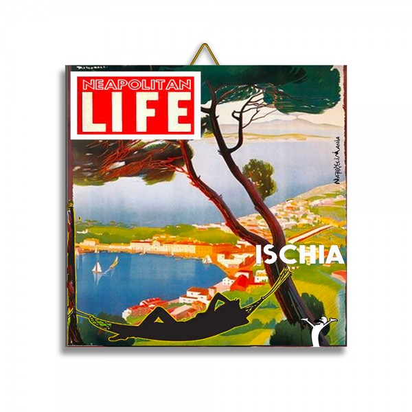 Mattonella con scritta "Ischia" in ceramica, disegnati da Enrico Durazzo per Napolimania.I colori e le sensazioni delle location più suggestive della costiera Amalfitana e Sorrentina e le meraviglie delle isole napoletane in un design ispirato alla pop-art by napolimania.