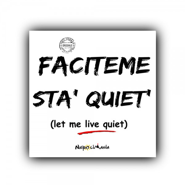 Questo magnete è molto più di un semplice accessorio: è un piccolo manifesto di una filosofia di vita. La frase "Faciteme stà quiete" può essere interpretata in modi diversi: un’esortazione a non essere disturbati nelle proprie attività quotidiane, una richiesta di pace mentale, o un modo scherzoso per comunicare il desiderio di evitare complicazioni e drammi. Risuona anche con la famosa attitudine napoletana del vivi e lascia vivere, che celebra la libertà di ognuno di essere sé stesso e di affrontare la vita con leggerezza.