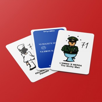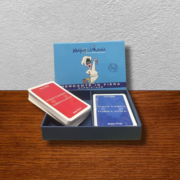 Carte da gioco Mercante in fiera. Un divertente gioco di società e un' idea regalo, o un souvenir, per chi ama Napoli, o per chi è nato qui ma è dovuto andar via! Le bellissime carte da gioco sono un articolo ideato da Napolimania e molto amato dai turisti! Giocare a carte è una tradizione a Napoli, soprattutto durante le feste di Natale e per il Mercante in fiera napoletano abbiamo pensato a due mazzi di carte con illustrazioni uniche: 'O mazz' 'e mammeta e 'o mazz' 'e soreta! Rendi Napoletanamente uniche le tue serate giochi con il nostro Mercante in fiera Napoletano! Il prodotto è realizzato interamente a Napoli, con un peso di circa 215 GR. e dalle dimensioni di 13X17 CM. I gadget creati da Napolimania possono essere considerati dai turisti italiani e stranieri come souvenir, ma anche come un nuovo modo della città di Napoli di presentarsi al mondo. Prodotti 100% napoletani... Diffidate dalle imitazioni!