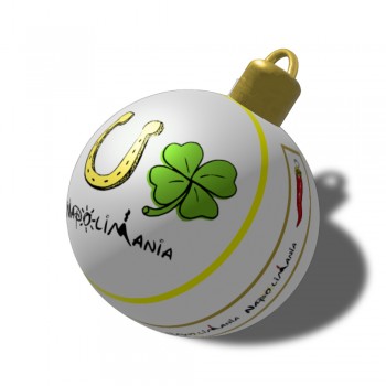Accanto ad esso, il quadrifoglio, con le sue foglie verde smeraldo, porta con sé la fortuna e la prosperità, mentre il ferro di cavallo, lavorato con maestria, simboleggia la protezione e la buona sorte. Questi elementi scaramantici tradizionali si fondono armoniosamente sulla superficie della pallina, creando un connubio di arte e cultura.