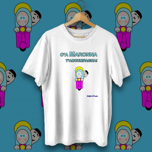 T-shirt "C'a Maronna t'accumpagna", cotone 100%, mezza manica, stampata con scritta in napoletano. Questo articolo viene personalizzato dalla creatività di Napolimania e rappresenta un diverso modo d'intendere la "napoletanità". La frase è sinonimo di protezione si augura a chi si vuol bene per ricevere una protezione!