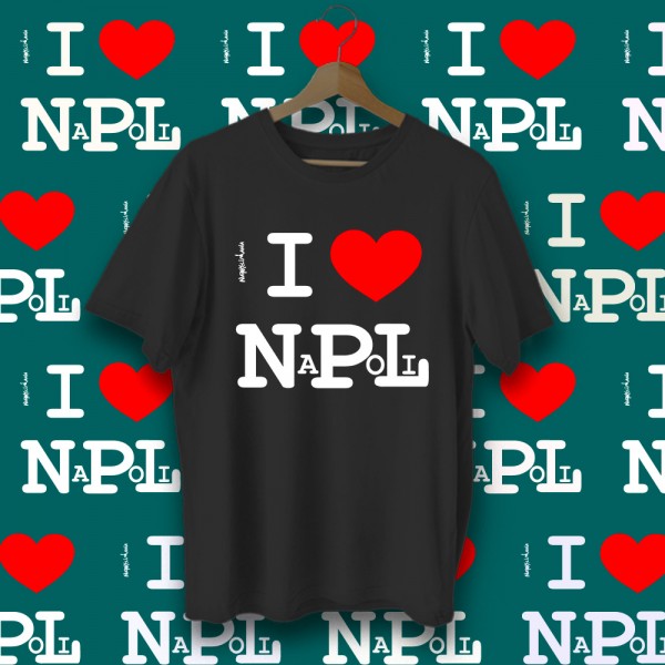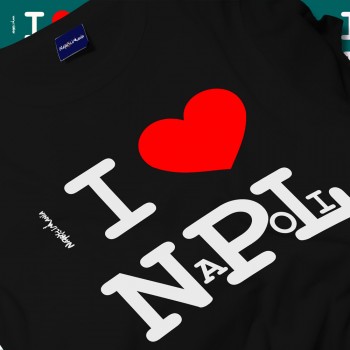 T-shirt "I love Napoli", colore nera cotone 100%, mezza manica. Il prodotto è realizzato interamente a Napoli.