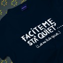 T-shirt "Faciteme sta' quiet'", maglietta in cotone 100%, mezza manica, stampata con scritta in napoletano. Articolo da regalo divertente e originale, perfetto per un amico o un familiare che ama Napoli. Creato dalla fantasia di Napolimania, con un materiale assolutamente naturale e facile da lavare. Il prodotto è realizzato interamente a Napoli. I gadget firmati Napolimania possono essere considerati dai turisti italiani e stranieri come souvenir, ma anche come un nuovo modo della città di Napoli di presentarsi al mondo. Prodotti 100% napoletani... Diffidate dalle imitazioni!