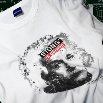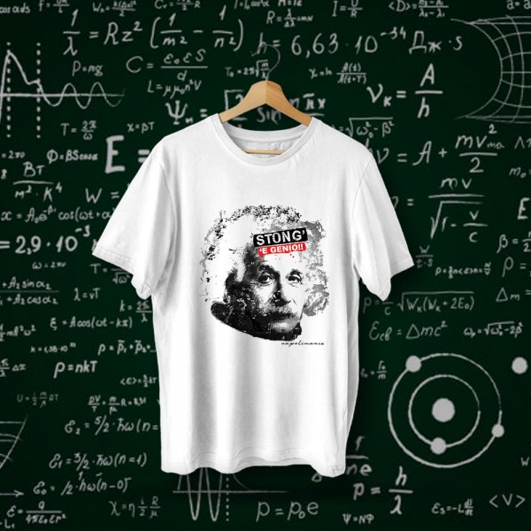 Sul petto, un’icona mondiale del cervello fino – un certo Albert, per gli amici – con quello sguardo da “so già tutto e anche di più”. Ma il vero tocco è la scritta rossa e nera che grida al mondo: STONG’ ‘E GENIO!!!. Una frase tutta napoletana che non si limita a dire “sono intelligente”: significa “sto alla grande”, “sono in forma smagliante”, “mi sento proprio a mio agio nel mio universo personale”. Un po’ come quando ti svegli e tutto fila liscio: il caffè è perfetto, il traffico miracolosamente scorre, e persino il vicino che di solito fa rumore… oggi è in ferie.